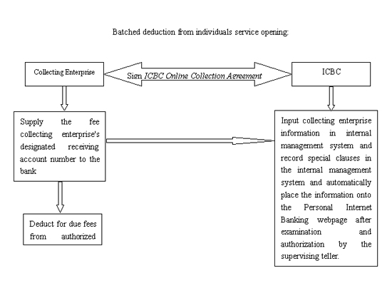 The collection service enables two functions including batched deduction from enterprises and batched deduction from individuals according to the different Paying Customers. The insurance companies give deduction instructions at any time through Internet Banking. The Intra-City transactions are executed within 24 hours through computer networks and the accounts are booked on real-time basis. The Inter-city transactions are done within fund transfer time limit and the instruction for express service is processed on real-time basis and the accounts are booked on real-time basis. The regular instructions are processed on real-time basis and the accounts are booked on batch basis. For villages and sub-towns under the county level where there is no presence of ICBC, the deduction can be realized through ICBC Internet Banking correspondent institution - rural credit cooperatives accounts. The service herein includes two methods - batched deduction from enterprises (i.e. a service where the insurance companies actively collect the due authorized premiums and fees through ICBC Internet Banking) and batched deduction from individuals (i.e. the Paying Customers are in mode of individual fee and premium collection, apart from the function of batched deduction from enterprises, it has additional function of "Enquiry for Paying Customer Name List").