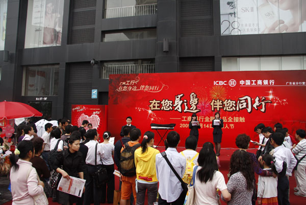2月14日情人节当天,工行广东分行营业部还在广百天河中怡店东广场、广州环市东路友谊广场两个广州地区的主要消费旺地以及其他重要商业场所、人流密集区域、大型住宅社区等126个分会场同步举办现场路演,以业务咨询、问卷调查、金融产品知识有奖问答、现场交流演示、刷卡消费奖励等活动与客户展开互动,使广大市民更加近距离地接触品种丰富、功能齐全、使用便捷的金融产品。