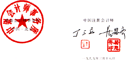 我们认为,上述会计报表符合《企业会计准则》和《金融企业会计制度》及国家其 他有关财务会计法规的规定;在所有重大方面公允的反映了贵行1998年度经营成果,会计处理方法的选用遵循了一贯性原则。
